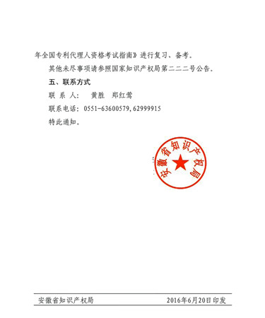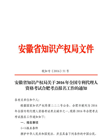 2016年全國專(zhuān)利代理人資格考試將開(kāi)始報名?,F將(皖知專(zhuān)〔2016〕51號)《安徽省知識產(chǎn)權局關(guān)于2016年全國專(zhuān)利代理人資格考試合肥考點(diǎn)報名工作的通知》轉發(fā)給你們。請各縣(區)知識產(chǎn)權局及各有關(guān)單位接通知后,積極組織做好報名動(dòng)員工作。