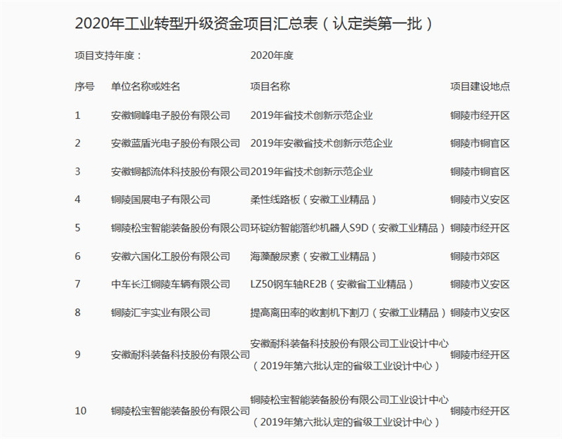 根據市政府下發(fā)《銅陵市人民政府辦公室關(guān)于印發(fā)銅陵市戰略性新興產(chǎn)業(yè)發(fā)展引導資金管理暫行辦法(2020年修訂)等五個(gè)辦法的通知)》(銅政辦[2020]6號)文件精神,經(jīng)縣區初審上報、我局會(huì )同市財政局進(jìn)行復核、并委托第三方評審、財政涉企系統比對核準等程序,初步完成了全市2020年工業(yè)轉型升級專(zhuān)項資金(第一批)項目情況的審核工作,現對擬支持的127個(gè)項目(見(jiàn)附表),進(jìn)行公示。公示期間7月31日--8月6日,歡迎社會(huì )各屆參與監督。相關(guān)意見(jiàn)和建議,請書(shū)面或發(fā)送電子郵件至hh15256616211@163.com。
