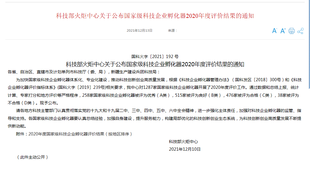 為加快國家級科技企業(yè)孵化器體系化、專(zhuān)業(yè)化建設,推動(dòng)科技創(chuàng )新創(chuàng )業(yè)高質(zhì)量發(fā)展。12月13日,科技部火炬中心公布了國家級科技企業(yè)孵化器2020年度評價(jià)結果,銅陵泰祥國家級科技企業(yè)孵化器被評為優(yōu)秀(A類(lèi))。